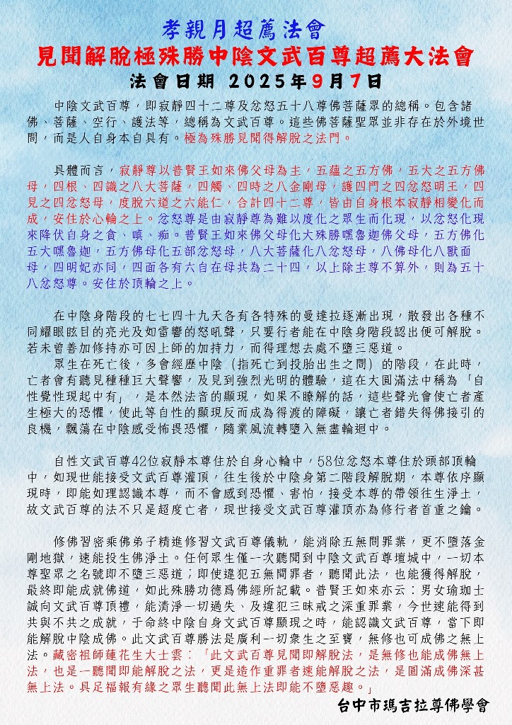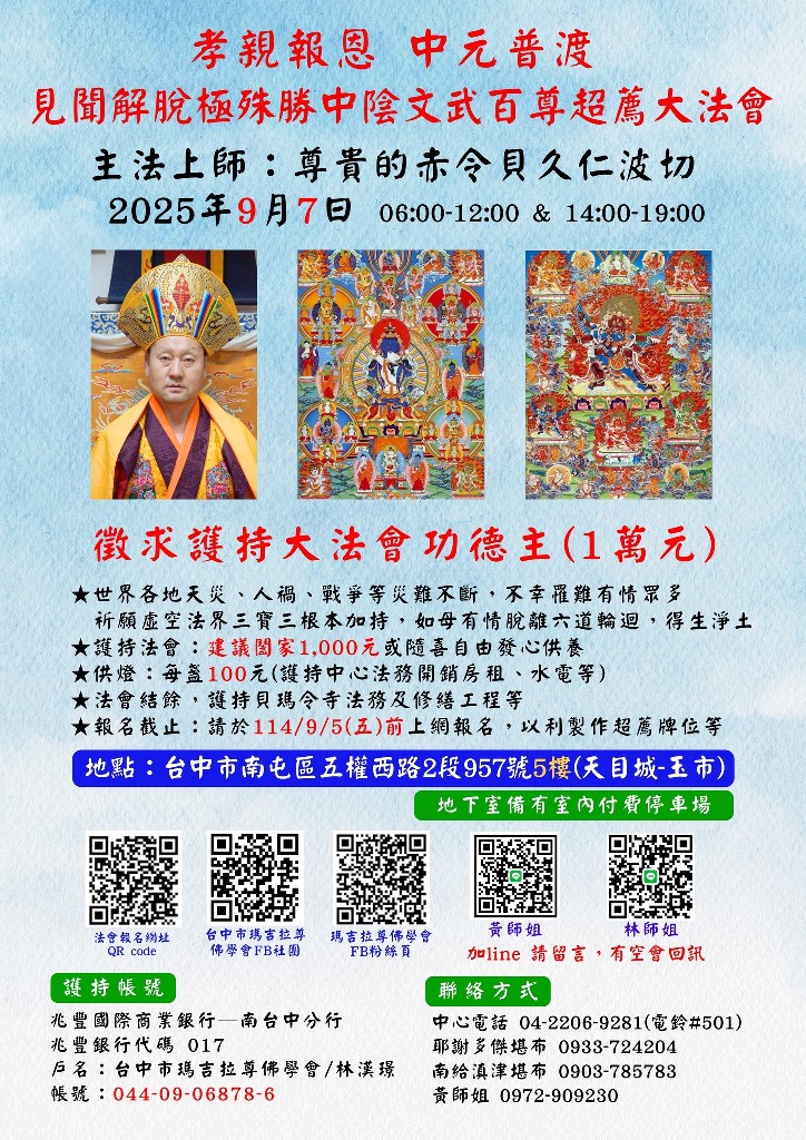 114/9/7見即解脫中陰文武百尊超渡法 主法上師:尊貴的 赤令貝久仁波切 噶舉 法會 2025/08/19~2025/09/07 我要參加 我要祈福 尊貴赤令貝久仁波切 徵求護持大法會功德主(1萬元) 【報名網址】https://www.beclass.com/rid=30500b76894b081257a2 【主法上師】尊貴的赤令貝久仁波切 【內容】見即解脫中陰文武百尊超渡祈福法會 【日期】114/9/7(日) 【時間】上午06:00-12:00&下午14:00-19:00 【法會地點】台中市南屯區五權西路2段957號5樓(天目城-玉市) ★室內備有付費停車場 【備註】 1.請提早報名以利製作超渡牌位及消災祈福名單 2.9/5(五)報名系統關閉報名 3.當日約10位僧眾 ---------------- ★詳情請見法訊 ---------------- 【護持法會項目】 一、贊助法會:建議闔家1000元或歡迎自由發心隨喜贊助 二、供燈:每盞100元(護持中心法務開銷房租、水電等) ★法會結餘:護持貝瑪令寺法務及修繕工程等 ------------------- 【護持帳號】 兆豐國際商業銀行─南台中分行 兆豐銀行代碼 017 戶名:台中市瑪吉拉尊佛學會/林漢璟 帳號:044-09-06878-6 【聯絡電話】 中心電話 04-2206-9281(電鈴#501) 耶謝多傑堪布 0933-724204 南給滇津堪布 0903-785783 林師姐 請掃描QR code加line 黃師姐 0972-909230(搜尋電話可加LINE) 相關資訊 友善列印 上一篇:114/8/16塔爹炯西瑟波施身法除障 下一篇:臺灣哲蚌吉祥果芒佛學會中元超薦祈福法會 台中市瑪吉拉尊佛學會 偉大的不丹竹巴噶舉傳承 ~ 成就者之王 夏迦師利傳承 - 二位真正實修 , 都曾代表不丹國師的 LAM 仁波切 密勒日巴尊者夢授破瓦法 . 施身法 . 及各類甚深教法,口傳傳授 每月不定期舉辦灌頂 . 除障 . 薈供 . 超渡 . 火供..等法會 施身法共修 聯絡電話: :0972-909230 地址 : 台中市西區篤信街43巷20號5樓之1 精選法訊 台灣佛法顯密洲佛學會2025.10月法訊 2025/10/15~2025/10/31 寧瑪 課程 『大悲救苦自解脫』大灌頂及儀軌傳授 2025/10/15~2025/10/26 寧瑪 修行 經續法林 【四念住】觀修 2025/10/15~2025/10/26 格魯 課程 2025年 10月 德威仁波切 主法法會 2025/10/17~2025/10/29 寧瑪 法會 天龍八部護法&酬供食子製作教授 2025/10/17 寧瑪 教學 財寶天王法會 2025/10/18 格魯 法會 放生息災延壽法會 2025/10/18 寧瑪 放生 喇嘛網| Facebook 全球慈悲智慧數位佛學院 全球藏傳佛教最新弘法訊息﹝ Google全球第一資訊同步 ﹞