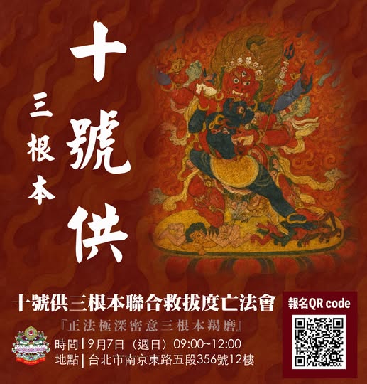 9/7十號供三根本度亡救拔法會 主法上師:尊貴的噶南卓上師 噶舉 法會 2025/09/07 我要參加 我要祈福 尊貴噶南卓仁波切 9/7十號供(三根本)羯磨聯合度亡 法會日期|9月7日(星期日) 時間| 上午 9:00 ~ 12:00 地點| 台北市南京東路五段356號12樓 洽詢電話|(02)2761-1177 ⸻ 本次共修將圓滿修持密法三根本: 上師|蓮花生大士 — 一切加持之根本 本尊|馬頭明王 — 一切成就之根本 空行|金剛亥母 — 一切事業之根本 三根本合修,是極殊勝的法門,能清淨業力與煩惱,滅除三門障礙,斷除輪迴流轉,激發善業力量,協助眾生早日往生淨土。 主法上師:尊貴的噶南卓 法會功德無量,誠摯邀請您參與共修 詳細參贊內容請見: 報名與參贊連結 https://www.beclass.com/rid=30500c968abc96e52102 查看洞察報告和廣告 加強推廣貼文 所有心情: 2020 相關資訊 友善列印 上一篇:2025佐欽【地藏王菩薩超度法會】 下一篇:10/12阿企佛母灌頂口傳法會 大手印五具佛學會 社團法人中華直貢噶舉大手印五具佛學會,由尊貴的 噶南卓仁波切創立,位於台北市松山區南京東路五段356號12樓 法會共修活動,福田共植,宗教服務,大手印學堂 聯絡電話: :0227611177 地址 : 台北市南京東路五段356號12樓 精選法訊 2025年 10月 德威仁波切 主法法會 2025/10/17~2025/10/29 寧瑪 法會 天龍八部護法&酬供食子製作教授 2025/10/17 寧瑪 教學 財寶天王法會 2025/10/18 格魯 法會 10/18《地藏·蓮師速降加持雨法會》 2025/10/18 寧瑪 法會 放生息災延壽法會 2025/10/18 寧瑪 放生 2025龍王地基主酬懺灌頂法會 2025/10/19 薩迦 灌頂 白雅仁波切圓寂三周年紀念法筵 2025/10/24 寧瑪 灌頂 10月26日豐原財寶天王招財法會 2025/10/26 格魯 法會 喇嘛網| Facebook 全球慈悲智慧數位佛學院 全球藏傳佛教最新弘法訊息﹝ Google全球第一資訊同步 ﹞