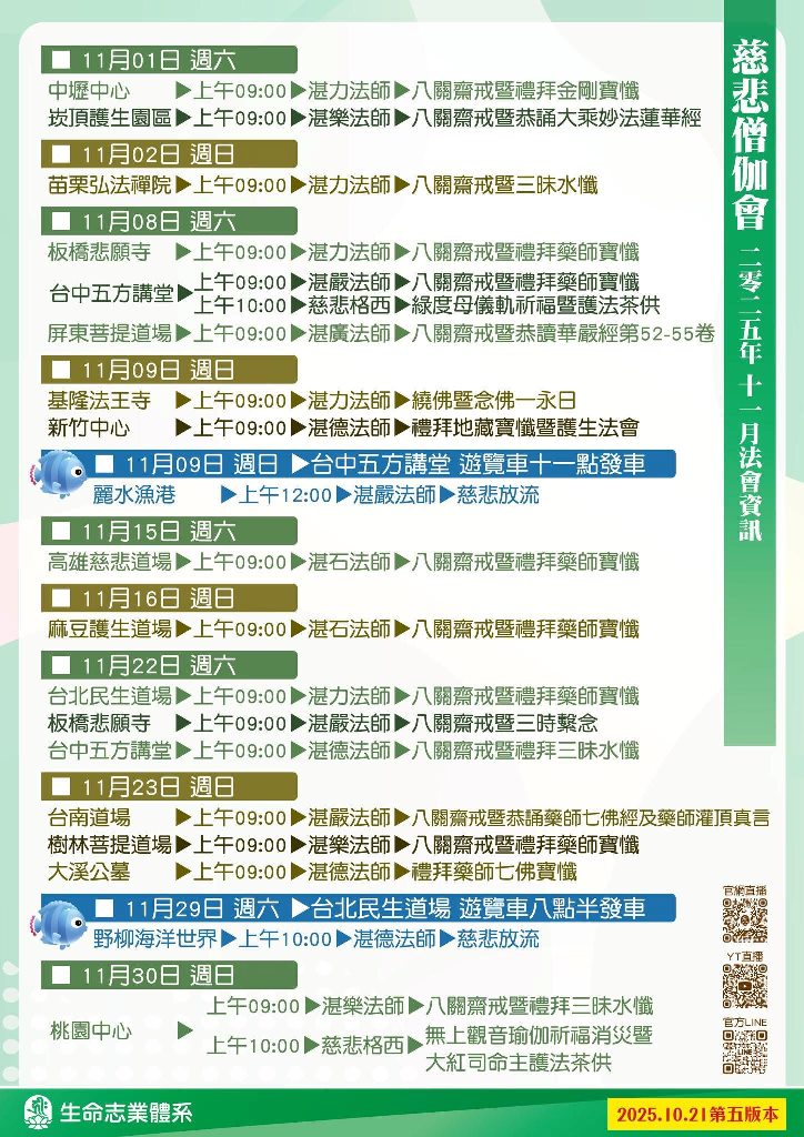 慈悲僧伽11月法訊公告 顯教 法會 2025/11/01~2025/11/30 慈悲僧伽2025年11月法訊公告 法會備有免費消災超薦牌位填寫 敬邀菩薩大德踴躍前往參加,同霑法益,共沐佛恩 友善列印 上一篇:妙法樂苑11~12月課表 下一篇:彰化弘願念佛會2026年行事曆 精選法訊 台灣佛法顯密洲佛學會2025.10月法訊 2025/10/24~2025/10/31 寧瑪 課程 『大悲救苦自解脫』大灌頂及儀軌傳授 2025/10/24~2025/10/26 寧瑪 修行 寶上師2025年10月法筵 2025/10/24~2025/10/28 寧瑪 法會 2025八德佛堂7-12行事曆 2025/10/25~2025/12/29 寧瑪 共修 經續法林2025年度寶瓶修法 2025/10/25~2025/11/22 格魯 法會 「格薩智慧大士上師瑜珈加持法」給薩財神 2025/10/25 寧瑪 法會 多傑綽洛&敦請八部護法行事業會供灌頂 2025/10/25 寧瑪 灌頂 開顯趨入甚深金剛瑜伽之道 2025/10/25~2025/11/29 格魯 課程 喇嘛網| Facebook 全球慈悲智慧數位佛學院 全球藏傳佛教最新弘法訊息﹝ Google全球第一資訊同步 ﹞