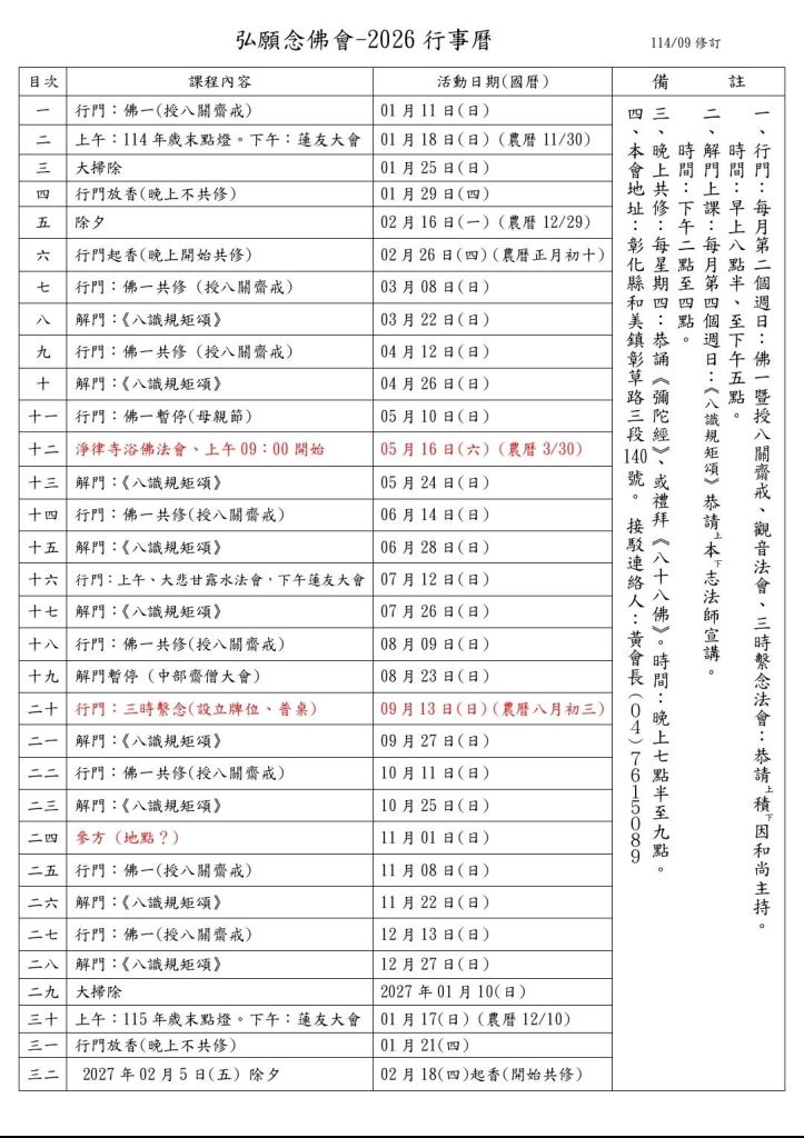 彰化弘願念佛會2026年行事曆 顯教 法會 2025/10/11~2027/02/05 彰化弘願念佛會2026年行事曆 2026/1/11-2027/2/5 友善列印 上一篇:慈悲僧伽11月法訊公告 下一篇:歲末心經除障法會暨心經網路共修 精選法訊 台灣佛法顯密洲佛學會2025.10月法訊 2025/10/24~2025/10/31 寧瑪 課程 『大悲救苦自解脫』大灌頂及儀軌傳授 2025/10/24~2025/10/26 寧瑪 修行 寶上師2025年10月法筵 2025/10/24~2025/10/28 寧瑪 法會 2025八德佛堂7-12行事曆 2025/10/25~2025/12/29 寧瑪 共修 經續法林2025年度寶瓶修法 2025/10/25~2025/11/22 格魯 法會 「格薩智慧大士上師瑜珈加持法」給薩財神 2025/10/25 寧瑪 法會 開顯趨入甚深金剛瑜伽之道 2025/10/25~2025/11/29 格魯 課程 南開寧波仁波切道場11月法訊 2025/10/25~2025/11/30 寧瑪 法會 喇嘛網| Facebook 全球慈悲智慧數位佛學院 全球藏傳佛教最新弘法訊息﹝ Google全球第一資訊同步 ﹞