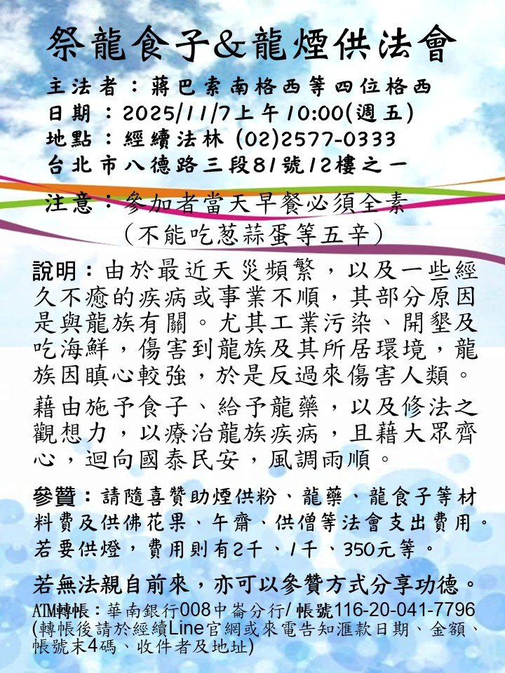 祭龍食子&龍煙供法會 主法上師:蔣巴索南格西等四位格西 格魯 法會 2025/11/07 蔣巴索南格西 祭龍食子&龍煙供法會 主法者:蔣巴索南格西等四位格西 日期:2025/11/7上午10:00(週五) 地點:經續法林(02)2577-0333 台北市八德路三段81號12樓之一 注意:參加者當天早餐必須全素 (不能吃葱蒜蛋等五辛) 友善列印 上一篇:馬鵬熾燃及龍欽寧體一切護法供養法會 下一篇:臺灣格魯總會2025燃燈節暨上師薈供 精選法訊 蘇曼噶舉高雄中心 2026年 光明點燈 2025/11/02~2026/02/28 噶舉 其它 11/7-11/9頂髻尊勝佛母千供延壽 2025/11/07~2025/11/09 噶舉 法會 祭龍食子&龍煙供法會 2025/11/07 格魯 法會 2025年蓮師滿願塔‧博達佛塔─盛大供燈 2025/11/08~2025/11/11 薩迦 共修 2025年11月熹嘉仁波台灣弘法 2025/11/08~2025/11/23 格魯 法會 熹嘉仁波切金剛經口傳暨教授課程 2025/11/08~2025/12/07 格魯 課程 天降日報恩培福大法會 2025/11/10~2025/11/11 寧瑪 法會 2025佐欽大圓滿【佛陀天降月】法會 2025/11/11 寧瑪 法會 喇嘛網| Facebook 全球慈悲智慧數位佛學院 全球藏傳佛教最新弘法訊息﹝ Google全球第一資訊同步 ﹞