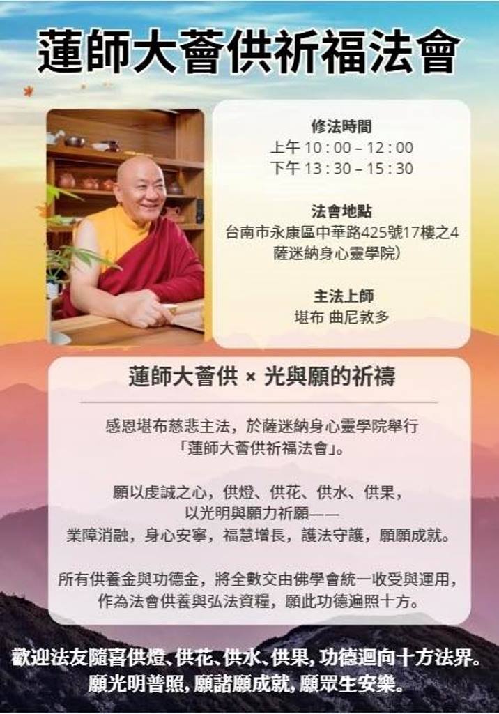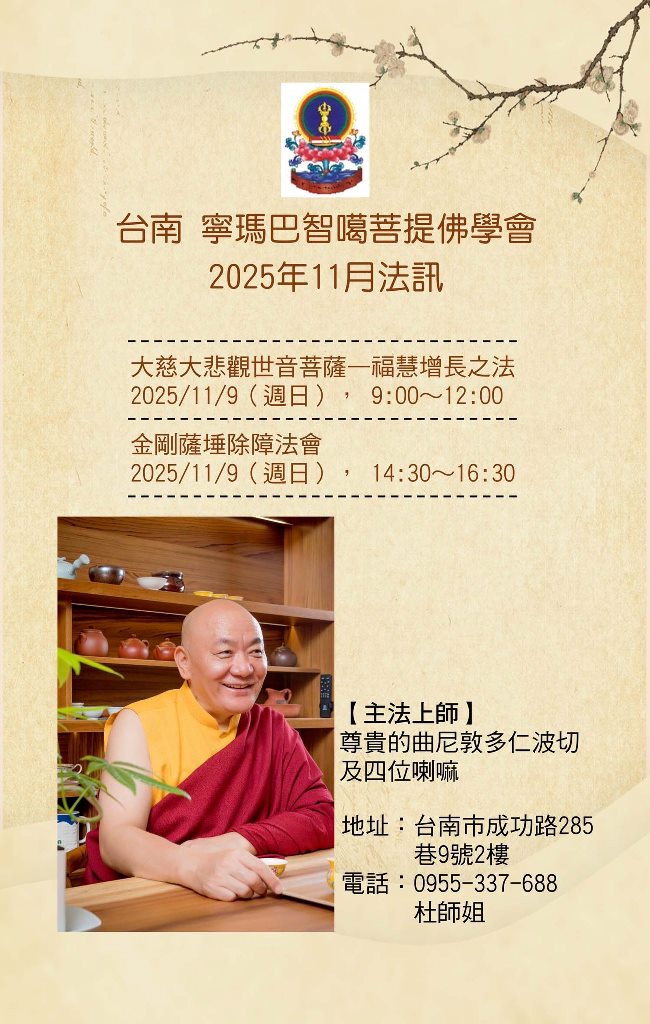 堪布 曲尼敦多仁波切於11月9日、10日在台南共有3場法會,